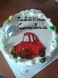 Marzipan cake mass decorate as desired. Minnie Mouse Version : Most weight Knead marzipan with red dye sprinkled with powdered sugar on the counter. Marzipan inserted between two large pieces of baking paper and roll out thinly . Marzipan lay on the cake. The easiest way is to move the marzipan together with paper , place it on the cake ( marzipan toward weight paper up ) and finally download the paper. To the residue remaining after the occupation of cake to add a little red dye and make a bow and tongue. With on-hook to make marzipan mass face. (Ideally, prepare yourself in advance templates and odrysować them on the rolled out marzipan ) . A little marzipan mass leave on the eyes and dots on bowle . Knead the rest of cocoa and make all the dark elements