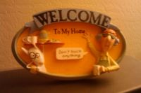 This isnt a sign; its a portal. Its a piece of home that screams, Youre here, and Im not going to let you ruin the mood. The warm, orange glow, the slightly off-kilter perspective, the tiny teacups perched like offerings its all a carefully orchestrated scene of cozy defiance. Its not just welcoming; its a theatrical, slightly sarcastic invitation to experience the soul of this place, where the rules are written in playful, cartoonish ink, and the heart beats louder than any Dont touch anything sign could ever suggest. Welcome, indeed but only if youre ready to be charmed, and maybe, just maybe, to not touch anything at all.