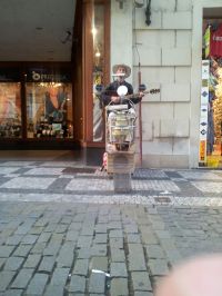 Hes there, perched on his peculiar throne a repurposed, wheeled drum kit, a metal cage of percussion, a cobbled-together orchestra of sound and grit. His hat, wide and sun-bleached, shields his eyes from the glare of the Preciosa shop window behind him, where glass and jewels catch the light like a trap for dreams. He strums not with idle fingers, but with purpose, coaxing melodies from his guitar as if it were a lover hes tending to. The world moves around him shoppers glance, tourists snap, a passerby drops a coin into his makeshift collection jar. To him, they are the rhythm section of his life, the pulse of the city hes chosen to inhabit.