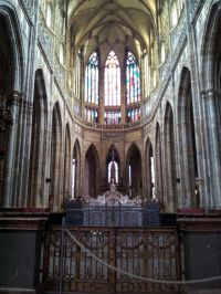 I stand within the cathedral of Saint Vitus, and the very air hums with the sacred geometry of centuries. Before me, the nave unfolds like a cathedrals spine, ribs of stone arching skyward in a skeletal embrace of Gothic grandeur not merely architecture, but a vertical prayer to the heavens. The light doesnt merely enter; it transforms. Through the towering, kaleidoscopic stained-glass windows, the sun is not just light its a stained narrative, a living mosaic of crimson, sapphire, and emerald that pours down like divine scripture, illuminating the stone like liquid gold. Each lancet window, each tracery, is not merely decoration its a theological map, a visual hymn designed to elevate the soul. The vaulted ceiling above me isnt just high its a vaulted cathedral of the soul, ribs of stone converging in a crown of light, a silent echo chamber of celestial architecture. The piers that hold this vertical world aloft are not just columns theyre the pillars of faith, weathered by time and prayer, their surfaces etched with the slow passage of devotion. In the sanctuarys heart, the altar gleams behind an ornate iron gate a threshold not just to the sacred, but to the very essence of the divine. The gate itself, wrought with intricate filigree, is a testament to human artistrys devotion to the sacred. The stone is not cold its a memory bank, each grain of sand in the mortar whispering of the masons, the kings, the monks who shaped this space. I am not merely observing I am standing inside the soul of the cathedral, breathing its ancient silence, feeling the weight of centuries pressing down, not as a burden, but as a consecration. This is not just a church it is the living archive of the eternal, a stone cathedral where light is scripture, and stone is memory.
