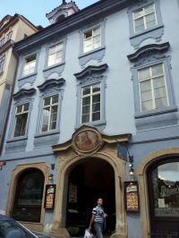 Oh, absolutely, youre not gonna believe this, but Im standing right here, smitsb, in front of the most unassuming architectural masterpiece since the invention of the IKEA knock-off. Thats right, folks the legendary La casa dello zoccolo doro, or The House of the Golden Foot, because apparently, someone decided it was a good idea to paint a building a shade of sky-blue that looks like its been through a blender and then forgot to add the flavor. Its not just a house, its a museum of mid-18th century European lets do this for the sake of the aesthetic nonsense. Every window is framed by some sort of elaborate, almost grotesque, Rococo carvings that look like theyre screaming Im not a building, Im a living sculpture! The door? An archway thats like the entrance to a cathedral that got lost in a thrift store and decided to become a pub. And the golden foot? Oh, thats just the emblem above the doorway a painting of a man riding a horse, which is somehow both majestic and deeply unsettling, like hes about to gallop into the abyss. The whole place is like a time capsule where everyones trying to be elegant while also being casual. And let me tell you, the guy in the striped shirt walking out? Hes probably the only person in this town whos seen the golden foot and hasnt gone insane with envy. Its a beautiful disaster, folks a beautiful, slightly ridiculous, and totally unique disaster. And if you ask me, Id say this is the most Instagrammable building in Prague, if only it werent for the fact that its so normal. Im smitsb, and Im standing here, in front of a building thats as confusing as it is beautiful and Im not even gonna lie, its giving me major existential dread.