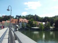 Im Smitsb, and as I step onto this bridge, Im not just crossing a river Im stepping into the heart of Landsberg, where time slows down and every corner whispers a story. The sun is warm on my skin, painting the red-tiled roofs of the town in golden light, and the water below mirrors the sky, calm and inviting, like a secret waiting to be shared. I can hear the gentle murmur of the river, a lullaby for the ancient castle perched high on the hill, its stone tower watching over everything with quiet dignity. Its not just a view its a feeling, a cozy embrace of history and nature woven together. The trees are thick and green, framing the houses like a loving family, and even the lamppost beside me feels like a friendly neighbor, ready to offer shade or light at just the right moment. Im not rushing here; Im savoring this. Every cobblestone, every window, every ripple in the water its all part of a story thats been told for centuries, and now, its telling it to me, one peaceful moment at a time. This is my quiet, heartwarming slice of Landsberg, where the past and present dance together like old friends sharing tea on a sunny afternoon.