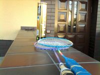 Behold, this is not merely a badminton setup its a vibrant, rebellious manifesto against the tyranny of the manicured court. I stand before you not as a spectator, but as an art critic whispering to the soul of the game: this is the democratization of athleticism, the glorious, unpretentious revolution of the backyard. Look at that racket its frame a riot of electric blue and purple, a chromatic rebellion against the drab, the very air of its rainbow strings humming with the promise of flight. It rests, defiantly, upon a simple, sun-baked tile ledge, a throne for the unchoreographed. Beside it, a golden can of shuttlecocks, gleaming like a temple of potential energy, ready to be unleashed into the wild air. The backdrop? A sturdy, geometric door ordinary, unassuming, yet somehow monumental in its mundanity. Its the stage, the frame, the silent witness to the chaos of the game. This is the truth: you dont need a court. You dont need a grandstand or a crowd. You need only a door that opens to your garden, the wind, and the raw, unbridled joy of a game that lives in the space between your siblings laughter and the first, perfect thwack of a shuttlecock against the strings. Its not just sport; its a ritual of connection, a celebration of the ordinary becoming extraordinary, one shuttlecock at a time. This is badminton. This is freedom. This is the game for everyone.