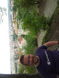 Look at me, the man in the purple Champion shirt, the one whos here to conquer the view, not just capture it. Im surrounded by greenery thats basically whispering, Youre not supposed to be here, but Im here, and Im loving every second. The path beneath me? Its like a forgotten trail thats been used by monks and tourists alike. And the city? Oh, its a kaleidoscope of red roofs and white facades, with a little bit of everything you can imagine a little bit of everything you cant imagine.