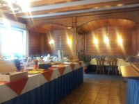 Yo, this ain't no five-star hotel breakfast lounge, nah this is the real deal, the kind of place where the morning sun bleeds through the window like a cheap-ass crime scene, and the wooden beams above? They ain't just ceiling decor, theyre the bones of a mountain lodge thats seen too many drunk tourists and hungry backpackers. Im standing in the middle of this sacred, slightly dusty battlefield called Sala Colazione, and Im not here for a photo op Im here to eat. Like, really eat. The buffet table? Its a war zone draped in a flag of red, white, and blue, covered in dishes that look like theyve been raided from a grandmothers kitchen. Theres toast, jam, cheese, eggs, fruit everything youd find at a Swiss chalet, except the Swiss are way more organized. The chairs? Theyre wooden, rustic, and look like theyve been here since the last ski season. The walls? Theyre lit by flickering lamps that cast shadows like ghosts, and the floor? Its tile thats seen too much foot traffic, too much spilled coffee, too much existential dread. Im not impressed. Im not even hungry. But Im here. And if you ask me, this place is more than just breakfast its a reminder that even in the middle of nowhere, somewhere, someones still trying to feed you. And thats a damn victory.
