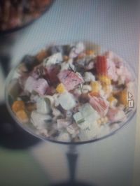 This salad has been made of Chinese instant soups soups. You need to cut into pieces of red pepper (can be canned or fresh) a few hard-boiled eggs, chopped onions, and of course the sauce made with a base of mayonnaise, sour cream and mustard. Do not forget the seasoning to taste.Really delicious!