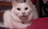 In this intimate, slightly grainy portrait, Bizzy doesn't just sit; she commands. Her pristine, cloud-like fur is the stuff of legends a living snowdrift, soft as a winter?s breath, yet radiating an aura of regal calm. Her eyes? Deep, dark pools of ancient wisdom or perhaps just a perfectly curated stare that says, ?I?m watching you. And I approve of your presence.? (Or maybe not.)