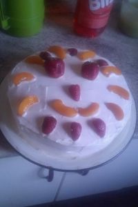 Yo, Robertsan here this is my personal dessert throne, and no one elses. Look at this cake, all swirled and creamy with that perfect white frosting, like a snowy mountain peak thats about to crumble under the weight of pure, unadulterated sweetness. I made it myself, and its got this insane fruit crown: plump, ruby-red strawberries staring back at you like theyre judging your life choices, and those orange slices? Theyre like little suns on a cloudy day, glistening with juice. And those little purple berries? Theyre the secret spice, the hidden magic that makes your tongue do a little dance. The whole things decorated with a flair thats basically I didnt care about perfection, I just wanted to look cute and delicious. Im not sharing. This is MY cake. Mine. Period. Im the king of this sugar-fueled kingdom. The flaite decoration? Thats my signature style messy, proud, and totally unapologetic. You think you want a slice? Try telling me that before youve even tasted the first bite. This cakes not just dessert its my claim to fame, my little rebellion against boring cakes. And yes, Im laughing because I know youre gonna try to steal a piece. Good luck, because Im already guarding it with my eyes and my fork.