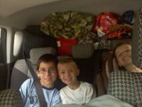 This isnt just a car ride, folks its the gritty, glorious, utterly chaotic prelude to the camping trip we all secretly need to survive. Look at these three little dudes, huddled like a triumvirate of wilderness warriors in the backseat, grinning like theyve just conquered the Amazon. Thats not just a seatbelt; thats the sacred cord of our impending adventure. And the ceiling? Oh, the ceiling! Thats not just headroom thats a war zone. That camouflage pillow? Its not decor; its a flag of our unspoken, unshakable pact to survive the outdoors. The orange and black chaos? Thats not junk; thats the very essence of our campsites soul, the stuff well be sleeping under, the very fabric of our wilderness. The checkered seats? Theyre not upholstery theyre the very seat of our rebellion against civilized life. This car? Its not a vehicle; its our chariot to the wild. Were not just going camping were going to experience it. Were going to be covered in mud, sing terrible campfire songs, and eat questionable food. And yes, Ill admit it I love it. This is the only way to really live, the only way to truly connect, the only way to remember what it means to be alive. This isnt just a trip its a declaration. And Im not just going to survive it Im going to thrive. And Im going to make sure you all remember it.