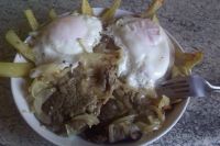 Okay, so this isnt some bland salad or a clean bowl this is a sacred battlefield of comfort food, and Im your tour guide. See that bed of crispy, golden fries? Thats the foundation, the crunchy, salty armor. And right there, nestled like two little suns rising over the horizon? Those are the perfectly poached eggs runny yolks like liquid sunshine, white and tender, sprinkled with that little black pepper kiss that screams Im fancy, but Im still a party.